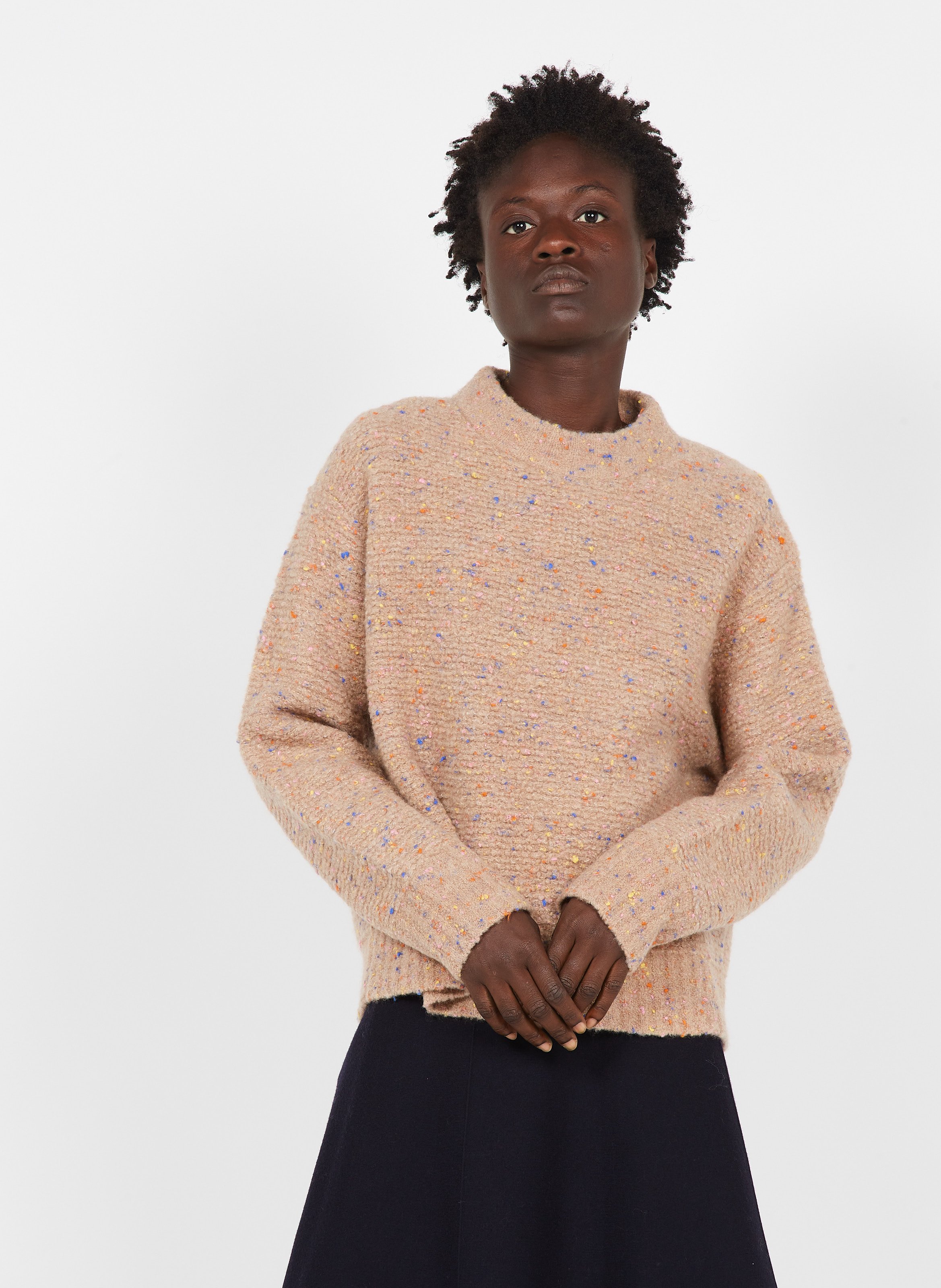 Round Neck Merino Wool Blend Jacquard Sweater Camel Multi Theory Women Place Des Tendances